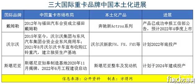 相比沃尔沃计划2022年底投产、斯堪尼亚计划2024年投产,奔驰重卡国产化进程明显更快。