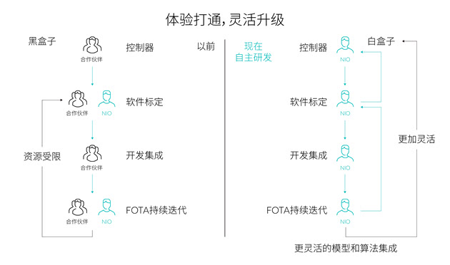 让“大脑”拥有“身体”的绝对控制权,离不开全自研的域控制器。以蔚来自研的智能底盘域控制器(NIO ICC)为例,它打破了国外悬架控制系统垄断的“黑盒子”解决方案,使车辆底盘系统拥有更宽的调试范围、更强的功能拓展性、完全的自主开发权域修改权。工程师可以随时对底盘进行优化调校,并通过FOTA实现常用常新的驾乘体验。