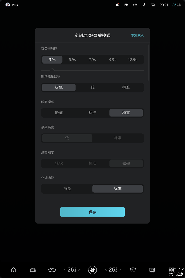 4. 节能模式侧重于在降低能耗的同时,提升能量回收效率,实现最长续航。此模式在舒适模式基础上,将能量回收由“低”升为“标准”,空调也进入节能模式。动力方面采用永磁电机单电机驱动(四驱系统在检测到状况时仍会适时介入),零百加速9.9秒。