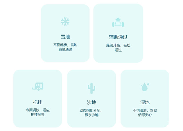 除了5种常规模式,工程团队还结合极端天气与户外出行,设计了雪地、辅助通过、拖挂*、沙地、湿地5种场景的场景模式,其中部分模式已上线,更多模式将随着FOTA发布并持续迭代。