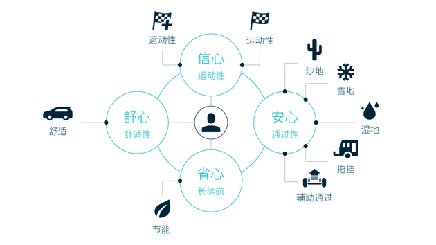 第二类目标为化解复杂的用车场景,例如雪地防滑、泥地防陷,它们以四驱系统和其它底盘控制系统为核心,同时关联驱动、传动、悬架、数字座舱等功能,实现更安心、自由的全场景驾驶体验。