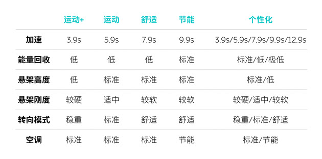 5. 个性化模式支持加速、转向、悬架高度、悬架刚度、空调性能、能量回收的自定义设定,用户可以结合自己的用车场景,打造专属模式。同时,用户还能基于四种标定模式对部分参数进行调节,进一步提升特定驾驶模式的定制体验。