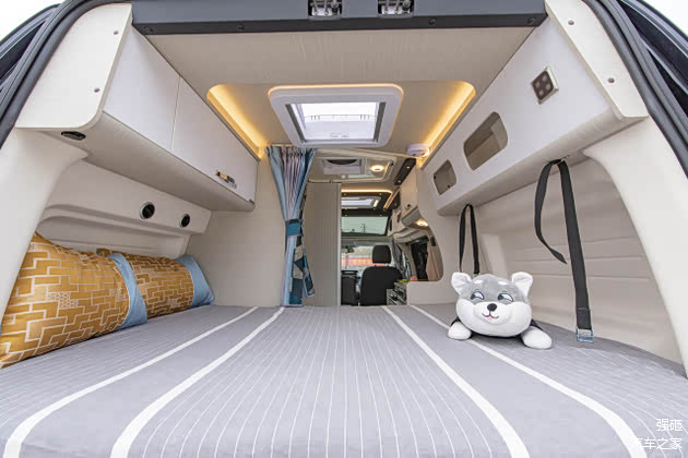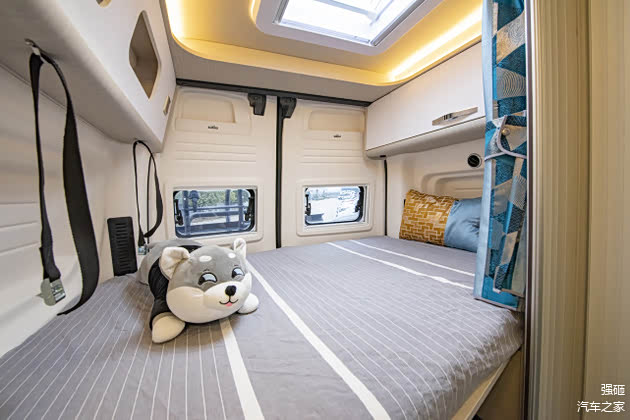 车内主卧,设在车尾,横置双人床布局,并且为了提升横向休息的长度空间,床两侧还采用内凹设计,在保障保温、静音的效果上,做到了最大的伸直空间。配置上,主卧安装有储物柜+储物格、220V电源插座以及顶部通风换气窗等。