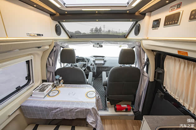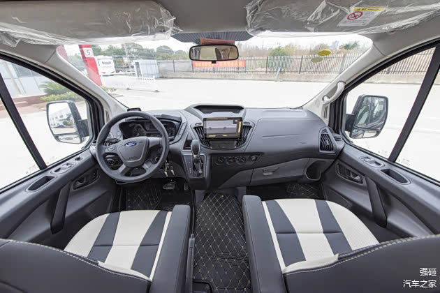 车头驾驶区保留了福特原来的乘用车布局设计,设有多功能方向盘、液晶娱乐导航屏、行车空调、杯托、主副两张带扶手座椅。但在风格上却有所升级,皮质加孔座椅包覆,提升乘坐的舒适性、耐久度和透气性,并在前方也采用黑色设计,提升酷炫风格。