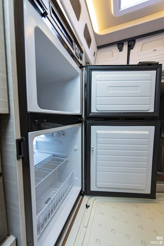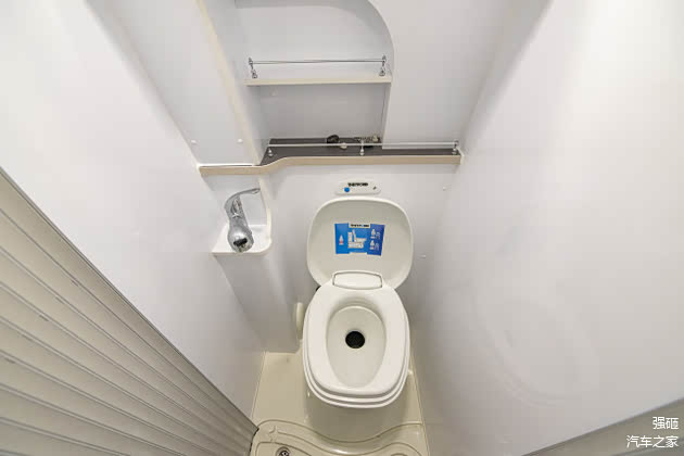 在顶部还带有储物槽和电源插座以及房车水电管理控制面板的集成区域,直接管控R500配备的800Ah房车专用锂电池、3000W充逆变一体机、90L食品级净水箱和40L灰水箱。其实,厨房看起来小,会觉得做饭的空间拥挤,但在实际使用上并不会!这得益于厨房对面卫生间的设计了。