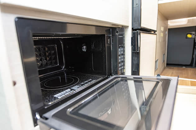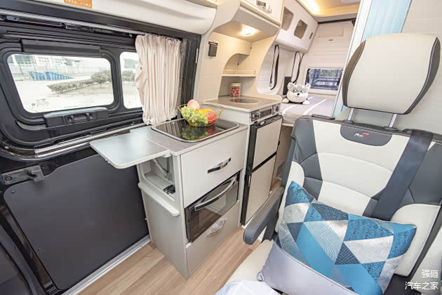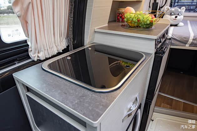 右侧厨房精致且多能,阶梯型集成拓展设计,左侧拓展板能提升厨房使用面积,低处为洗漱间,高处设有电磁炉,而且临近车门位置,做饭也能很好地排解水汽油烟。