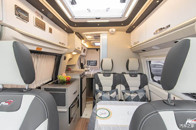 R500房车内部,首先在风格上,与车外潮酷的设计形成强烈的反差,内部更柔和,也更体现起居舒适的重要性,以象牙白横纹、环保板材以及三扇天窗塑造,既照顾到了生活的色彩搭配,也实现了环保居住的必要性,更把通风性做到了最佳。其次在布局方面,车内以左侧双人会客区+后横置床+中部厨房和半开放式卫生间设计,用以满足1-2人日常使用的需求。