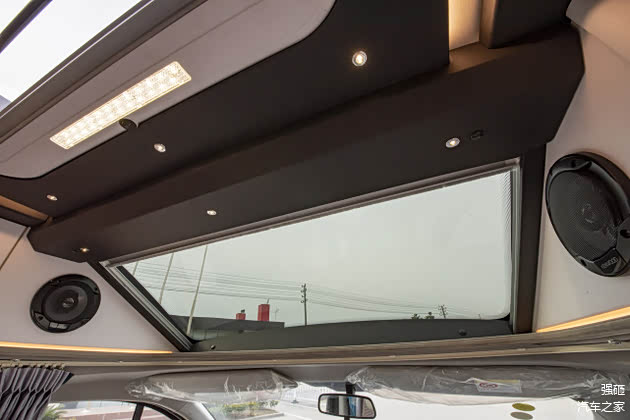 驾驶区顶部,配备一扇固定式曲面天幕,提升车内的采光效果,而在两侧还安装有环绕影音系统。