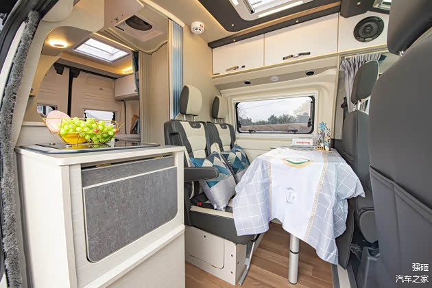 会客区能坐2人,配备有2张M1级乘用车座椅和1张可移动式升降餐桌,连接主副驾驶座椅,可形成4人客厅布局。在顶部,安装有吸顶式储物柜,内侧配备观景通风橱窗,底部带有220V电源插座以及USB接口等用电设备。此外,车内空调系统也均采用底置设计,配备有低置单冷空调与伟巴斯特燃油暖风热水一体机双系统,为车内提供冷、热气。
