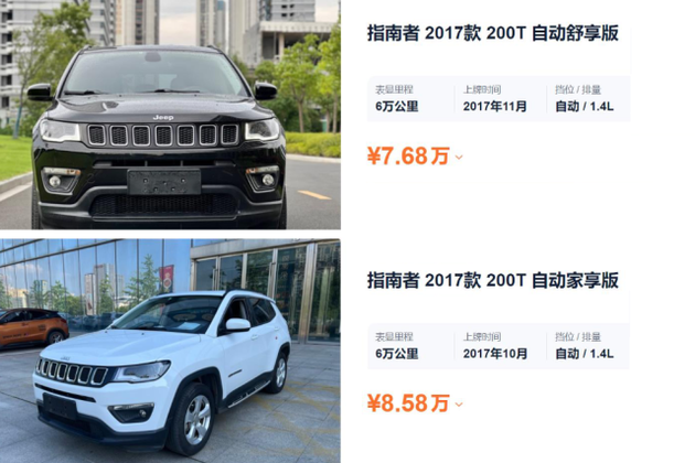 根据我们调查情况来看,Jeep指南者目前二手车源多以2017款、2019款为主,其中,2017款车源最多,这也是最早一批国产的Jeep指南者,只不过保值率比较一般,车龄5年行驶6万公里的指南者,二手车挂牌价在8万元左右,而实际成交价可能还会低一点。2019款车型里程数普遍更低一些,价格也只要9万元出头,但这类车型的车源比较少。