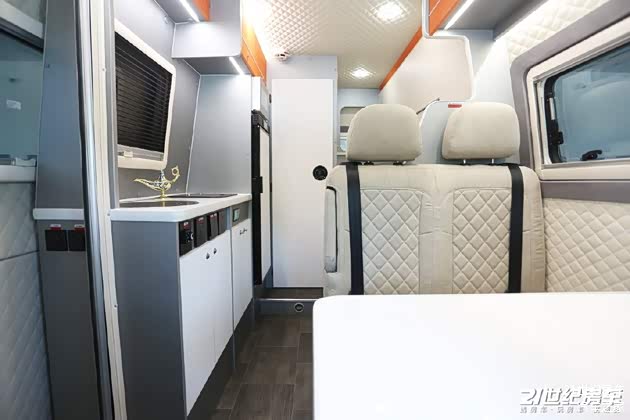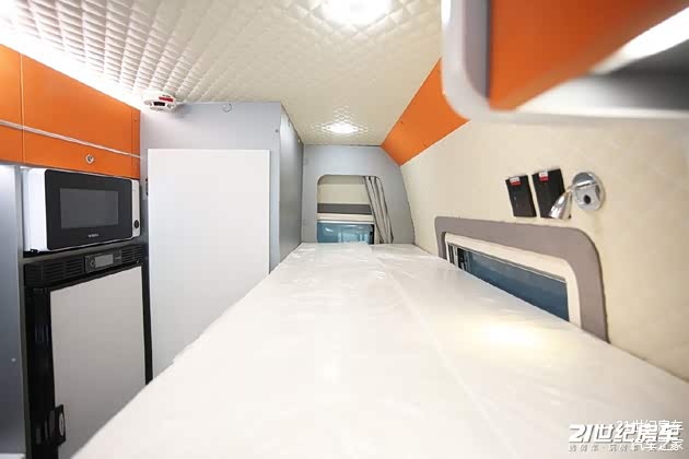 整个内饰风格注重年轻化,橙色储物柜点缀让整台车更有活力。另外,生活区内部用料比较厚道,车顶、车侧位置的皮革软包随处可见。
