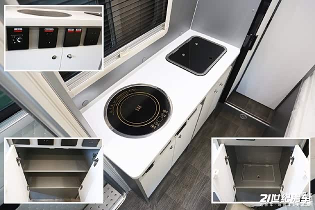 打开滑动门,我们即能看到户外厨房设备,包括户外柴油灶、调料架等等,最终让这台B型房车不仅可以旅居在路上,停下来露营依然惬意。