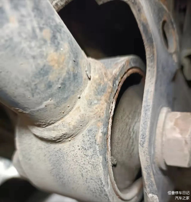 整个底盘非常松散,胶套全部老化开裂了,摆臂都生锈了。