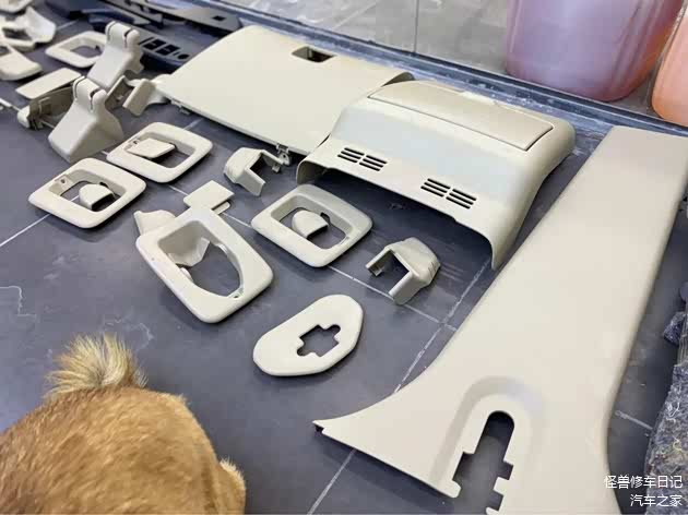一段时间后,内饰塑料件也全部翻新好了,店里旺财的屁股有点抢镜了。