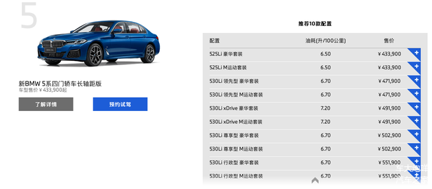 8月17日,笔者从宝马官网获悉, 宝马5系对配置进行了调整,同时530i系列车型的发动机功率有所下调,不过售价部分则与此前保持一致。目前,宝马5系长轴版共提供10款车型,售价区间为43.39万-55.19万元,标准轴距版则有4款车型可选,指导价为42.99万-60.99万元,至于宝马5系插电式混合动力版本则提供3款车型,官方售价为49.99万-53.69万元。值得一提的是,据悉具体的配置变化会体现在今年9月份生产下线的车型上。