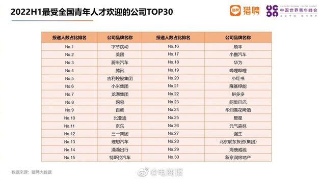 日前,猎聘联合中国世界青年峰会共同发布《2022全国青年人才就业趋势洞察》。洞察显示,上半年全国青年人才投递的公司TOP30中,蔚来汽车排名第三,仅次于字节跳动和美团。