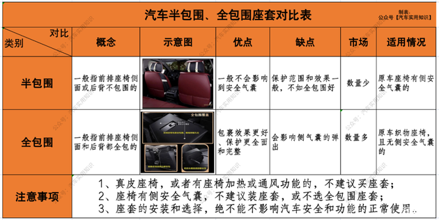 汽车座套可以分为半包围款和全包围款的,目前市场上以全包围为主,而这两种都有其各自的优缺点,具体如下表所示: