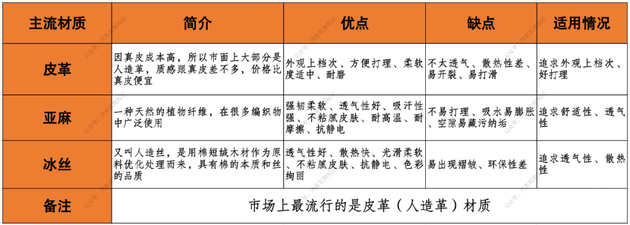 材质:追求外观上档次好打理选皮革,追求舒适性和透气性选亚麻、追求透气性和散热性选冰丝;