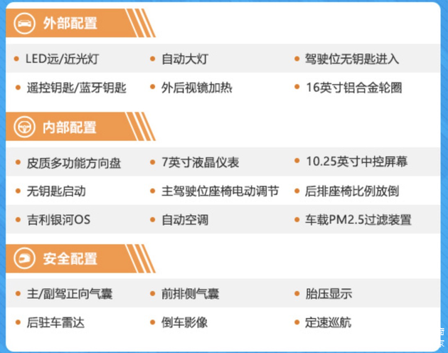 一般来说,很多厂商推出的入门版车型都相对鸡肋,配置方面堪称寒酸。但看完指导价11.37万吉利星瑞精英型的配置之后发现,其实并不算低。像LED远/近光灯、自动大灯、驻车雷达、倒车影像、定速巡航、无钥匙进入、无钥匙启动、自动空调、前排正向气囊等都是非常实用的配置,并且该车还搭载了银河OS车机系统。整体看来以实用为主,配置方面与寒酸二字没有半毛钱关系。