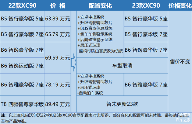 近日,沃尔沃2023款XC90上市,这一代XC90于2015年引进国内,2019年(2020款)进行了中期改款,本次2023款为年度例行配置调整,除了插电式混合动力的T8车型暂未更新2023款外,48V轻混B5、B6车型由原先的5款调整为4款,取消了22款“B6智逸运动版”,其余车型指导价不变,配置进行了调整,具体如下: