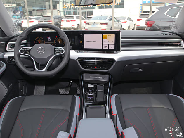 内饰也进行了突破,甚至挡住车标你已经不能明确感受出这是一台大众车了,双液晶屏在大众家族很常见,但是都是分开放置,没有这种连屏的形式,连屏后部是贯穿出风口的设计,下部采用的是银色饰板来拉升科技感,而空调则保留了触控面板,这一点基本做到了实用与美观的折中。
