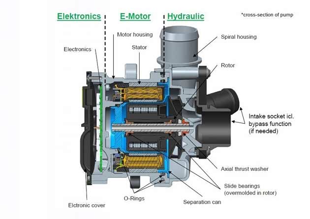 电子水泵:传统的机械水泵改为电子水泵,消除皮带驱动带来的摩擦损失和机械噪声。采用PWM/LIN通讯控制,由发动机ECU直接控制,可根据冷却需求灵活控制冷却流量,能够实现: