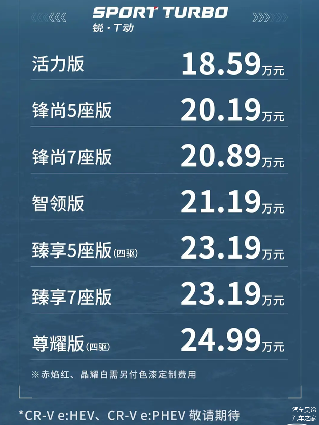 在刚刚过去的9月28日,新一代CR-V正式上市,作为CR-V的第六代车型,现有七种不同配置的燃油车型可供我们选择,官方价位从最低的18.59万元到最高的24.99万元不等,混动车型暂未上市。