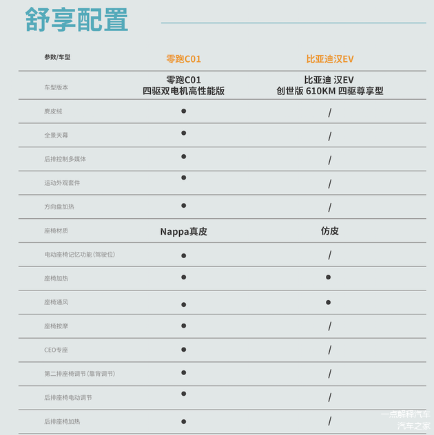 科技舒享配置上,两者差距较大。零跑C01全系标配的80项豪华智能配置中,含麂皮绒顶棚、全景天幕、方向盘加热、座椅加热/通风/按摩、Nappa真皮座椅、驾驶位电动座椅记忆、第二排座椅靠背调节、后排座椅电动调节、后排座椅加热等多达14项舒享功能,丰富且强大。比亚迪汉EV座椅材质为仿皮,仅具备座椅加热、座椅通风等少数几项舒享功能,与零跑C01相差甚远。