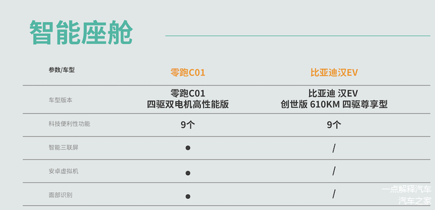 9月28日正式上市的零跑C01,作为新生代的智能轿跑,对比一些老将,在智能化程度上表现如何呢?我们选择了售价28.86万元的汉EV 2022款创世版610KM四驱尊享型(以下简称:汉EV)和售价28.68万元的零跑C012022款四驱双电机高性能版(以下简称:零跑C01)来进行比对,看看谁才是真正的智能“标兵”。