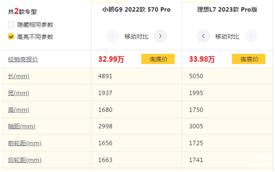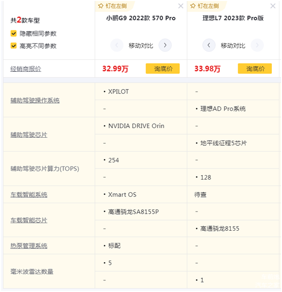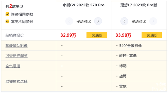 小鹏汽车立足于新能源汽车市场的核心杀手锏就是其智能技术,号称全栈自研的小鹏汽车在科技这个环节毫不吝惜。但所有的配置都要基于相同的价格才有意义。我选择了小鹏G9 570 Pro和理想L7 Pro版作为对比车型,两款车型的售价分别为32.99和33.98万元,价差1万元左右。