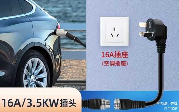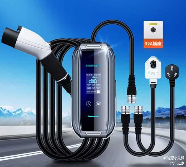 然后它还可以当作随车充,换上转接头就可以跟车携带,只要有16A的三孔插座就能使用。而且充电器还自带屏幕,可以实时显示各项充电数据,双温控保护可以有效杜绝安全隐患。