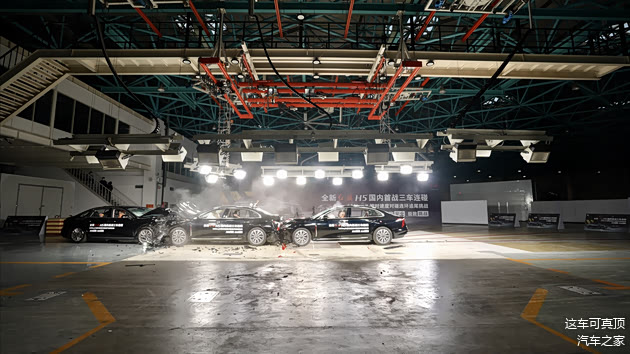 正因为对被动安全配置有足够的信心,新款红旗H5还公开测试了复杂三车连环碰撞实验。两车以50Km/h的时速对向碰撞,另一辆车以同样的速度追尾前车,碰撞结果显示三车均有出色的安全保护性能,车内假人伤害值综合得分率均在90%以上。