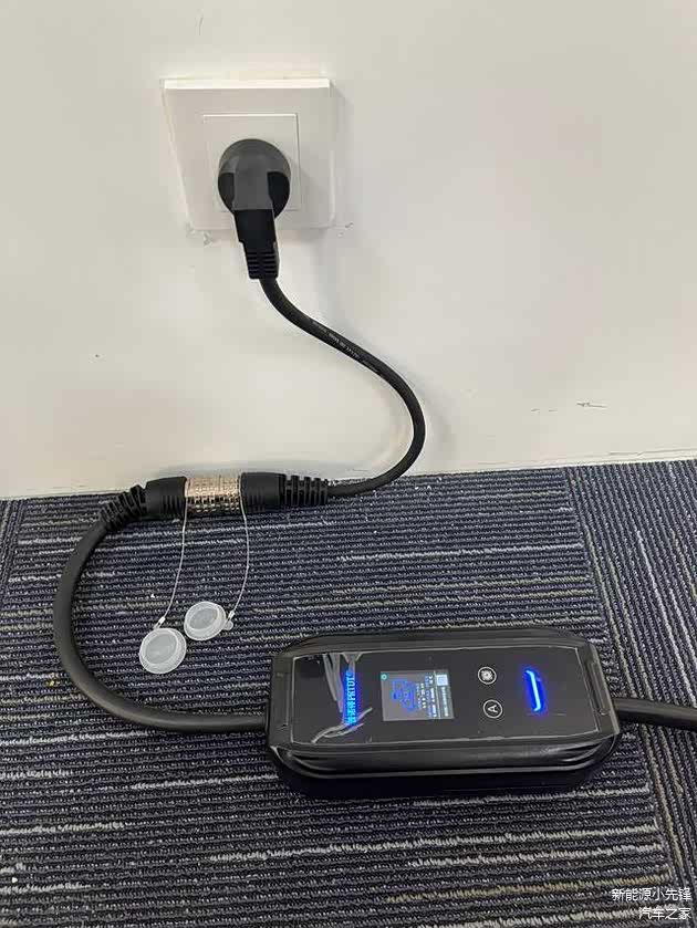 这款随车充体积小巧,可以很方便的跟车携带,而且只需要找到一个16A的三孔插座就可以接上给车充电,速度可以达到1.6KWKW每小时,这是因为能量损耗加上车机限制,所以功率只有1.6KW左右。