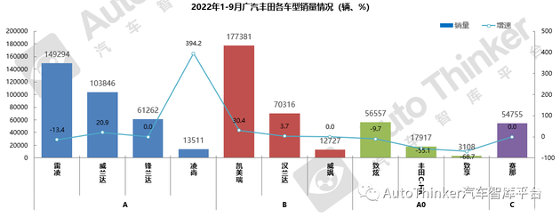 从车型销量数据来看,在A级车和B级车市场,依旧是以雷凌、威兰达、凯美瑞和汉兰达等经典车型为主。在TNGA架构的加持下,凯美瑞车型2022年1-9月销售17.7万辆,同比增长30.4%。威兰达和汉兰达也有着不错的市场表现,销量同比也有不同程度增长。锋兰达自2022年1月6日上市以来,共销售61262辆,并且近三月以来销量保持在万辆左右。