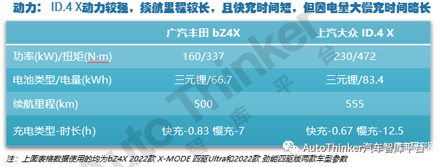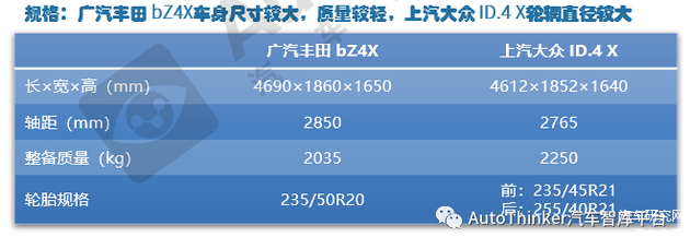 2022年10月10日,广汽丰田bZ4X正式上市。广汽丰田bZ4X与上汽大众 ID.4 X相比在车身尺寸和整备质量方便占有优势,但在动力和续航方面不及上汽大众ID.4 X 。在智能化配置方面两者也是各有特点,广汽丰田bZ4X全系标配“TSS 3.0智行安全系统” ,而上汽大众 ID.4 X的AR-HUD增强现实抬头显示也让高配车型更有吸引力。