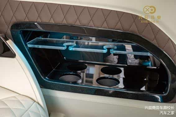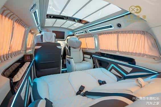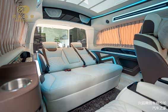 第三排座椅升级电动沙发床,比原厂的调整角度更大,还能放平变成一张小床休息。侧墙也进行了重新定制,杯架、氛围灯、储物格、扶手等都配备了。
