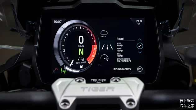 Tiger 1200有5种骑行模式,通过7寸全彩TFT仪表可轻松切换。仪表显示效果也很清晰,阳光下也能正常读取骑行数据,并且具备互联功能还能控制GoPro,不满意的就是仪表选项依然没有中文。