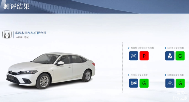 除了北京现代伊兰特,广汽本田型格、东风本田思域这两款紧凑型车也参与了碰撞测试,其中型格可视为思域的姊妹车型。测试结果显示,型格和思域都获得了3G评价,安全性非常出色。只不过,两款车的耐撞性与维修经济性指数都只获得了较差(P)评价,跟伊兰特一样。