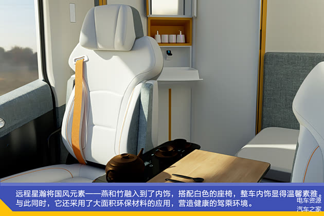 远程星瀚将国风元素——燕和竹融入到了内饰,搭配白色的座椅,整车内饰显得温馨素雅。与此同时,它还采用了大面积环保材料的应用,营造健康的驾乘环境,它的智能新风系统随时监测和净化车内空气。