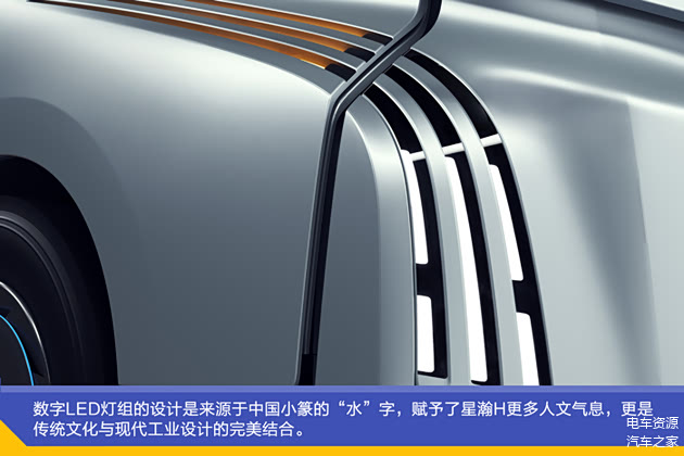 远程LOGO呼吸灯和数字LED的前大灯灯组共同组成了星瀚H的“流星灯语”,创意十足,璀璨夺目。LOGO灯是采用呼吸的闪烁形式,和人体呼吸的频率保持一致,赋予了星瀚H仿佛具有生命的魅力。数字LED灯组的设计是来源于中国小篆的“水”字,赋予了星瀚H更多人文气息,更是传统文化与现代工业设计的完美结合。