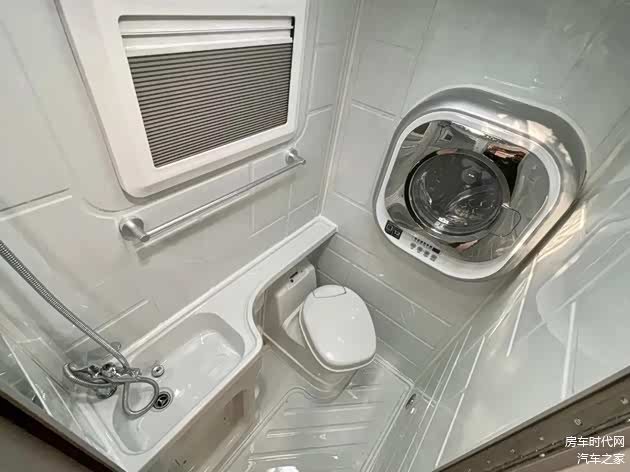 /洗衣机细节/卫浴间为干湿一体式设计,一体成型拥有更好的防水防霉性,配置有房车进口专用座便器、外置抽拉式黑水箱、房车专用换气扇、洗手池、冷热水龙头等,保障一路的卫浴需求,用户还可以使用内嵌在墙内的洗衣机清洗衣物,旅途更加轻松。