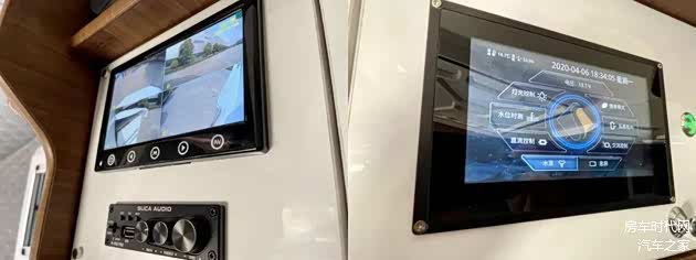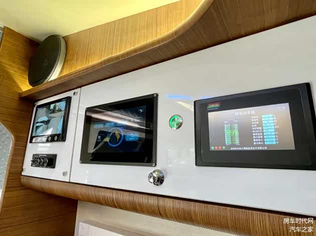 中门的上方为整车的水电中控系统以及四路监控显示屏,可以随时观测车辆周围与水电使用情况,方便对系统进行调控。