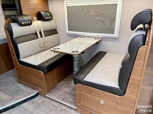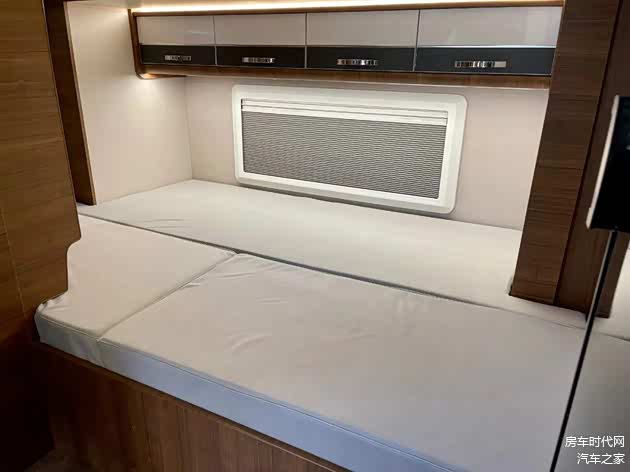 内饰板材采用了轻质内饰板以及E0级家具板、额头区为皮革包覆,在保温降噪性方面有所增强。整车采用了金丝胡桃横纹板材内饰,清新雅致,从前到后依次为驾驶室+额头床、会客区、厨房区、卫浴间以及车尾睡卧区。