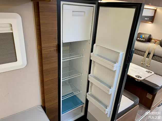 为在旅途中保障食物的新鲜,车内还配置了一台12V/150L房车专用车载静音冰箱,台面的上方装载了一台微波炉,帮助快速解冻食材、加热食物。