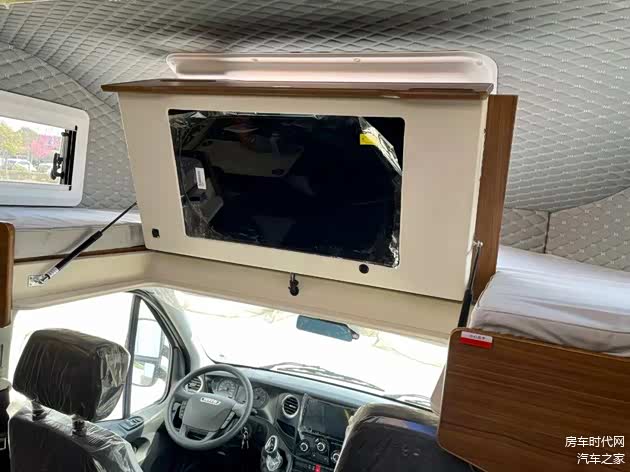 驾驶室上方为额头床,软包的设计防止了意外磕碰,床铺一周设计有床帘,保障睡卧的私密性。床铺的下方内嵌了一台32寸液晶电视,娱乐旅居生活。