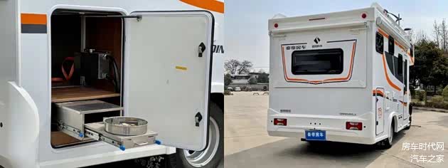 车外配置丰富,配有重力注水口、外置取水口、外置充电口、外置取电口等基础设施,此外还配备了进口房车专用手动遮阳棚、房车专用电动伸缩踏步、房车专用乘客门(带中控),车尾为储物舱设计,舱体下方为外置燃气灶,拉开即可在户外进行制餐。
