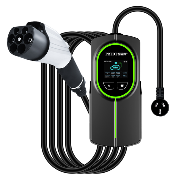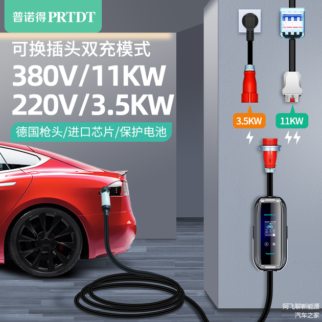 普诺得有一款32A7KW和16A3.5KW的两用的便携式充电器,这款充电器配有16A和32A两种接头,使用16A接头时,最大充电功率是3.5kw;使用32A接头时,需要使用专用插座,最大充电功率是7KW。这个插座我们可以把它安装在公司、老家、工厂你经常去的地方,都可以安装一个。