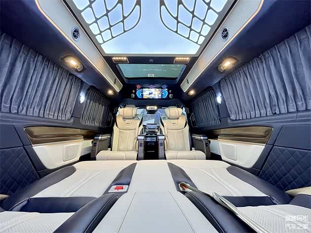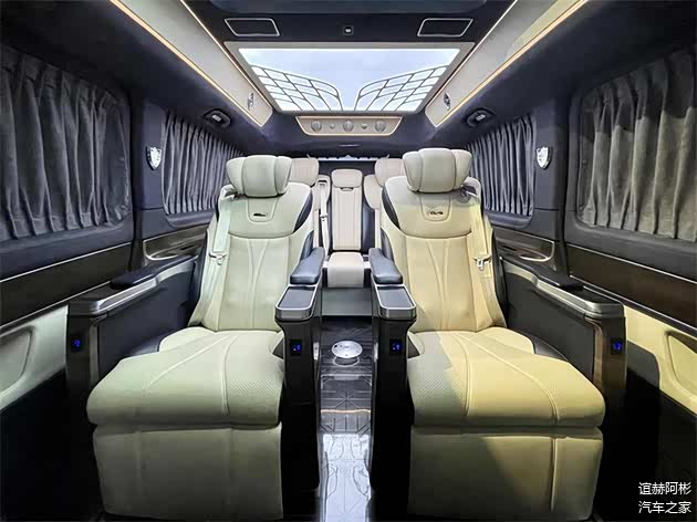 车辆外观基本保留了奔驰的原貌,你一眼就能看到巨大的三角星标志。没有那么多复杂的外观,看起来更简洁。主副驾驶以及侧门都做了软包隔音处理,整个驾驶舱都采用奔驰新款轿车的设计风格,豪华感浓郁,V260L全新的悬浮显示屏升级为触屏控制,驾驶舱视野开阔。