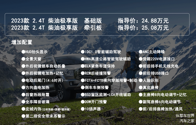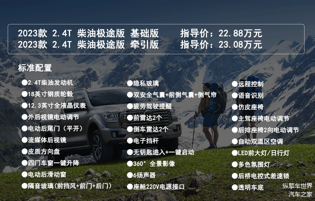 2.4T柴油极途版配置相当丰富,标配就有6安全气囊、360度全景影像、全速自适应巡航、无钥匙进入、前后排电动座椅、LED大灯组、自动空调等,相比一些乘用车也不落下风,加上全系最低的价格,性价比很高,如果预算不是特别充足,选择这一款就可以了。
