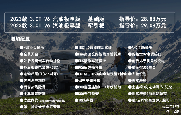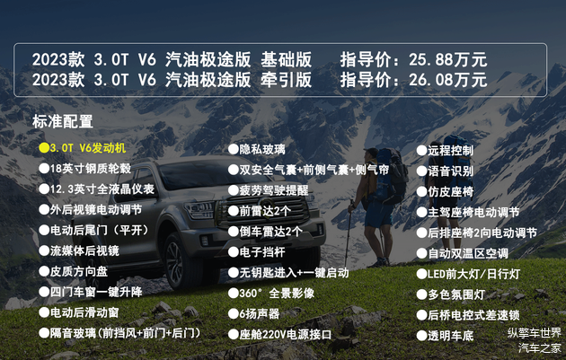 在售车型中,如果你更偏重于它的工具车属性,入门级的2.4T柴油极途版配置够用,价格更低,同时后续的养护成本也相对低一些,扭矩方面也比3.0T V6柴油版差不了多少,脱困能力也是有的。如果你除了偶尔拉点货物,同时还要兼顾家用,更推荐3.0T V6汽油极享版,一是汽油版的静谧性更好,二是它的舒适配置和驾驶辅助功能都能带来更好、更安全的体验。当然如果你是一位狂热的越野爱好者,预算充足的情况下顶配车型才能更好的满足你。